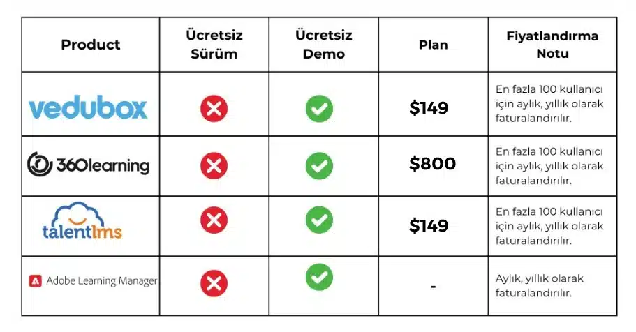 Aşağıda başlangıç fiyatları, ücretsiz deneme süreleri ve freemium sürümleri gibi önemli faktörler dikkate alınarak, çeşitli LMS yazılımlarının nasıl karşılaştırıldığını gösteren bir tablo sunuyoruz. Bu karşılaştırmalar, eğitim programlarınız için en uygun LMS yazılımını seçerken bilinçli bir karar vermenize olanak tanır.