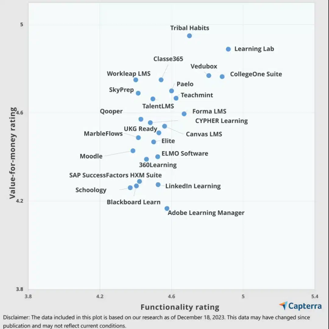 Kullanıcı puanlarına göre en iyi fiyat-performans ve işlevsellik sunan LMS araçları, aşağıdaki Capterra grafiğinde yer alıyor. Ürünler, fiyat-performans puanlarına göre yukarı doğru (daha iyi değer sunanlar en üstte) ve işlevsellik puanlarına göre sağa doğru (daha fazla işlevsellik sunanlar en sağda) artan şekilde sıralanmıştır. Bu sıralama, potansiyel alıcıların bütçelerine uygun en işlevsel LMS çözümlerini kolayca belirlemelerine yardımcı olmayı amaçlar.