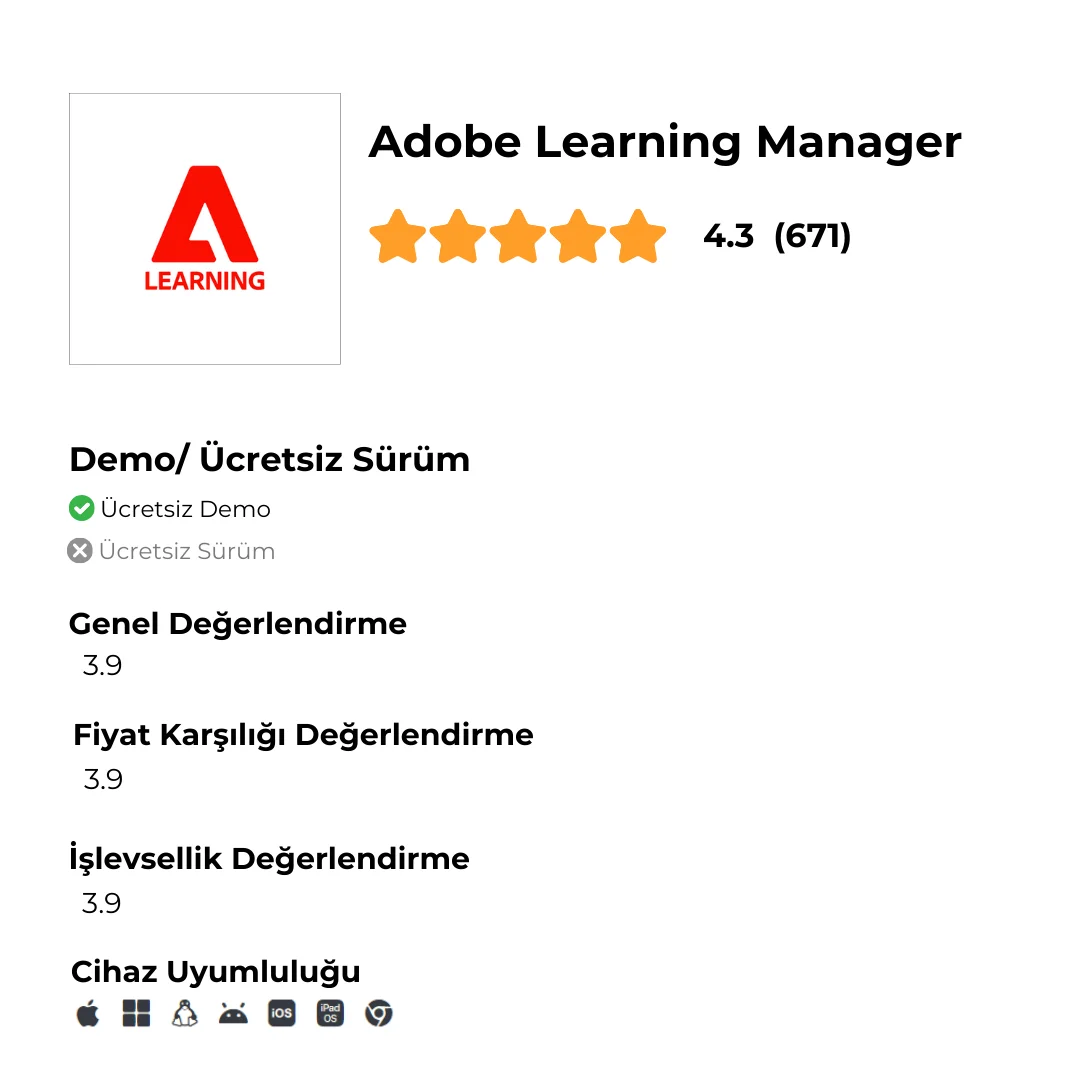 Başlangıç fiyatında mevcut özellikler: Adobe Learning Manager’ın başlangıç planı, kişiselleştirilmiş öğrenme yolculukları, çoklu cihaz uyumluluğu, sosyal öğrenme ve topluluklar, raporlama ve analitikler, ve SCORM & xAPI standartlarını destekleyen içerik entegrasyonu sunar. Ayrıca, otomatik rol ataması ve kullanıcı yönetimi gibi yönetim özelliklerine sahiptir.